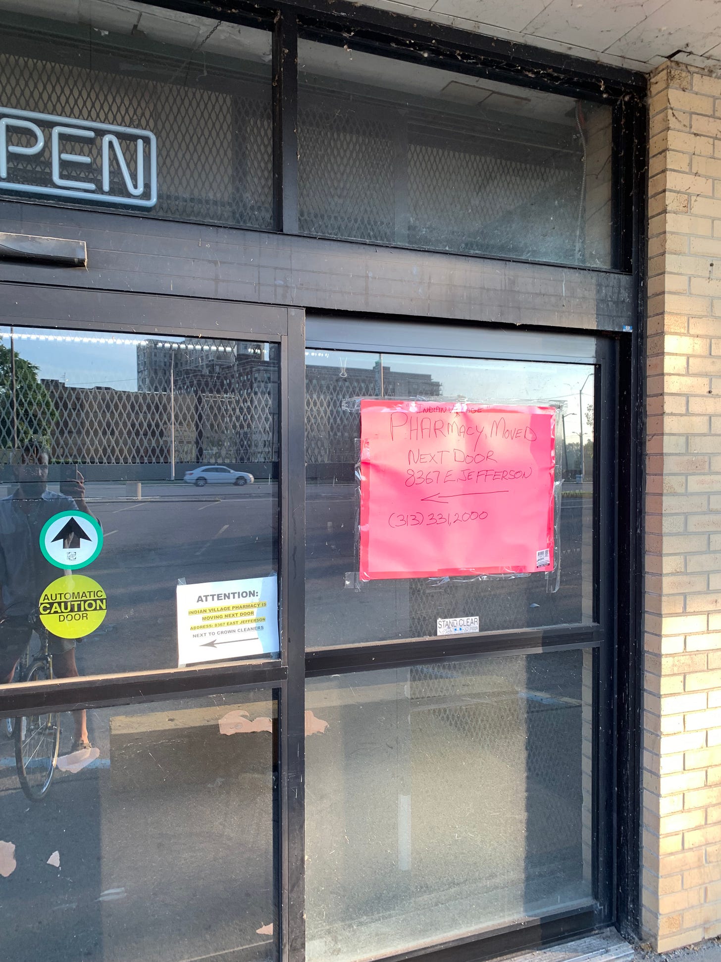 On the corner of East Jefferson and Van Dyke in Detroit’s historic Indian Village, the only walkable grocery store for miles has gone dark. The Indian Village Marketplace, which once served the East Side for over 40 years is now sun-bleached and silent. The parking lot is empty, and a pink paper taped to the glass reads: “Pharmacy moved next door.”